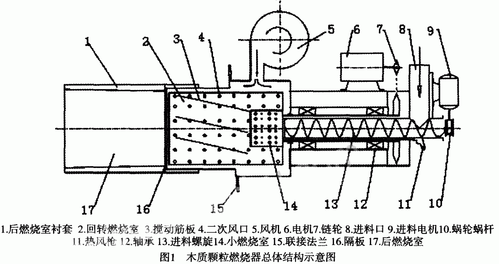 摘要:為治理城市環(huán)境污染。國(guó)家禁止城市的小型鍋爐燃燒原煤,但取而代之的燃油、燃?xì)忮仩t其使用成本卻相對(duì)較高。隨著生物質(zhì)顆粒能源的發(fā)展,產(chǎn)能的迅速提升,用于小型鍋爐的木質(zhì)顆粒燃燒器的研究受到重視。木質(zhì)顆粒燃燒器的使用既能減少污染,又能降低成本。本文針對(duì)小型鍋爐用木質(zhì)顆粒燃燒器的結(jié)構(gòu)進(jìn)行研究和設(shè)計(jì)。實(shí)踐證明,該結(jié)構(gòu)能有效防止燃燒器燃燒過(guò)程中易結(jié)渣和燃燒效率低的弊病。 1引言 鍋爐容量越小,熱效率越低,燃燒越不完全,生成的煙塵量也越多,大氣污染就越嚴(yán)重。因此,為減少排放,城市小型鍋爐禁止燃燒原煤,以提高空氣的質(zhì)量。取而代之的燃油、燃?xì)忮仩t,雖然使用方便,燃燒充分,排放較少,對(duì)環(huán)境的污染較小,但使用成本過(guò)高。 近年來(lái),隨著新能源的開(kāi)發(fā)與利用,生物質(zhì)燃料的利用量逐步擴(kuò)大。木質(zhì)顆粒燃料作為典型的生物質(zhì)固體成型燃料之一,具有容易點(diǎn)火、能源密度高、高效、潔凈、二氧化碳近零排放等優(yōu)點(diǎn),可替代煤炭等化石燃料應(yīng)用于炊事、供暖等民用領(lǐng)域以及鍋爐、發(fā)電等工業(yè)領(lǐng)域。另外,木質(zhì)顆粒燃燒器可通過(guò)實(shí)現(xiàn)自動(dòng)控制以及連續(xù)自動(dòng)燃燒,更能廣泛應(yīng)用于小型生物質(zhì)鍋爐、熱風(fēng)爐、采暖爐等小型設(shè)備中。木質(zhì)顆粒燃燒器在國(guó)外有些發(fā)達(dá)國(guó)家(如瑞典等)的應(yīng)用已經(jīng)相當(dāng)成熟。我國(guó)的生物質(zhì)成型燃料產(chǎn)業(yè)的發(fā)展也很迅速,成型燃料技術(shù)已相對(duì)成熟,但相關(guān)的燃燒設(shè)備尚處于研究開(kāi)發(fā)階段。特別是木質(zhì)顆粒燃燒器,存在自動(dòng)化程度低、生產(chǎn)過(guò)程中污染氣體排放高、積灰結(jié)渣嚴(yán)重和生產(chǎn)過(guò)程環(huán)境惡劣等問(wèn)題。因此本文針對(duì)木質(zhì)顆粒燃料的特性,采用多級(jí)配風(fēng)和旋轉(zhuǎn)燃燒室等措施,設(shè)計(jì)出一種能夠用于小型鍋爐的木質(zhì)顆粒燃燒器。 2整機(jī)結(jié)構(gòu)與工作原理 為了提高木質(zhì)顆粒燃燒器的熱效率,使燃燒更為充分,減少煙塵量的生成,本木質(zhì)顆粒燃燒器采用回轉(zhuǎn)燃燒室和二次配風(fēng)。此外,還采用螺旋進(jìn)料裝置控制進(jìn)料量,以保證顆粒燃料的充分燃燒,控制結(jié)渣嚴(yán)重現(xiàn)象。整機(jī)結(jié)構(gòu)示意圖如圖1所示,主要由風(fēng)機(jī)5、螺旋進(jìn)料機(jī)構(gòu)13、回轉(zhuǎn)燃燒室2、后燃燒室17、點(diǎn)火裝置11等部分組成。 工作時(shí),木質(zhì)顆粒從進(jìn)料口8進(jìn)入到進(jìn)料螺旋管中,在進(jìn)料螺旋機(jī)構(gòu)的作用下,快速、平穩(wěn)、均勻地推進(jìn)到回轉(zhuǎn)燃燒室。在回轉(zhuǎn)燃燒室內(nèi),燃料被干Designand Research設(shè)計(jì)與研究燥,然后進(jìn)入燃燒區(qū)域,木質(zhì)顆粒完成一次燃燒所需要的空氣通過(guò)鼓風(fēng)機(jī)將源源不斷的氣流從回轉(zhuǎn)燃燒室的下部和環(huán)繞在燃燒床內(nèi)的燃燒盤(pán)上的小孔進(jìn)入,并提供適宜的燃料,空氣比,營(yíng)造理想的燃燒氛圍。在木質(zhì)顆粒的一次燃燒區(qū)域之后,在環(huán)繞整個(gè)燃燒室外的二次風(fēng)口4處吹人二次風(fēng)。這些二次空氣使燃燒繼續(xù)進(jìn)行,使燃燒更加充分,氣化的所有燃料在后燃燒室17完全燃燒。