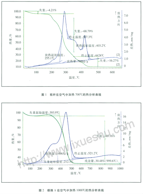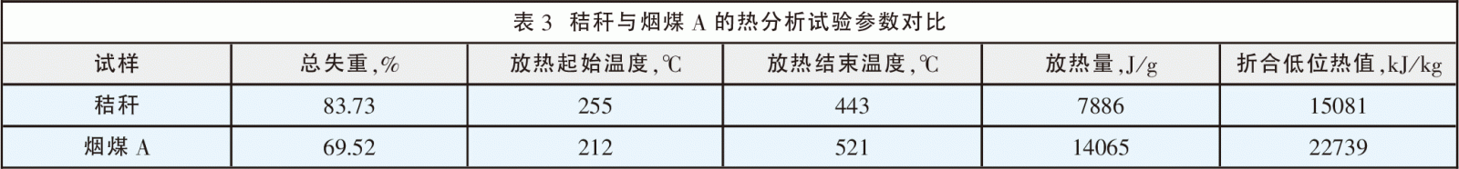 從圖1的失重曲線可以看出,秸稈共有三段明顯的失重曲線,第一段為在空氣中失水,失重率為4.21%,這和空氣干燥基測得的水分相似;第二段為一種有機(jī)物在燃燒,這部分有機(jī)物占了絕大部分,失重率為68.79%;第三段為固定碳在燃燒,這部分占16.27%,可見秸稈與煤相比為低碳燃料。秸稈燃燒后留下的灰分大約為10%,這部分灰分主要成分為碳酸鉀,是植物根系從土壤中吸收的礦物質(zhì)。 從圖1的熱分析曲線還可以看出,秸稈共有兩段明顯的放熱:第一階段從255℃放熱開始至307℃結(jié)束,第二階段從403℃開始至443℃結(jié)束,兩段放熱量總計(jì)為7886J/g,這說明秸稈開始放熱的溫度不是很高,比較容易點(diǎn)燃,這也是由于秸稈的有機(jī)物含量較高的原因。而它的發(fā)熱量同比一般煙煤的發(fā)熱量要少,第一段放熱占總放熱量的絕大部分,并且此段燃燒起來要猛烈、迅速。為了與煤的熱分析進(jìn)行詳細(xì)對比,圖2是某煙煤A的熱分析曲線圖,表3是秸稈與煙煤A的熱分析參數(shù)對比。
