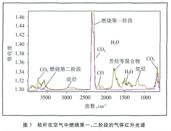 從圖2與表3中可以看出:秸稈的總失重為83.73%,比煙煤A的失重量69.52%要多,這說明秸稈的燃盡度比煙煤A的高,這是因?yàn)榻斩挼闹饕煞譃槔w維素、半纖維素、木質(zhì)素等,比較容易燃盡;煙煤A的放熱主要由揮發(fā)分與固定碳兩部分組成,而秸稈的放熱也是由兩部分組成。它們的放熱起始溫度差不多,而放熱結(jié)束溫度秸稈要比煙煤A提前78℃,這說明秸稈的活性和煙煤A差不多;從放熱量來看,秸稈的放熱量要少于煙煤A的不到一半,這里所說的放熱量指熱分析儀器直接測定的放熱量,由于試驗(yàn)過程中坩堝是開口的,邊燃燒邊放熱至出口,所以要想求得相應(yīng)的低位熱值必須用經(jīng)驗(yàn)公式求得。折合后的秸稈的低位熱值為15081kJ/kg,同比煤的低位熱值為一半之多。 所以,從秸稈的燃盡度、放熱起始溫度與終止溫度以及放熱量來看,秸稈在水泥窯中是一種較好的可替代燃料。 2.2秸稈的紅外試驗(yàn) 為了探討秸稈燃燒時(shí)排放的氣體種類,在對秸稈做熱分析試驗(yàn)的同時(shí)對其氣體排放特性也做了熱紅聯(lián)用試驗(yàn),也就是利用德國布魯克生產(chǎn)的傅立葉紅外光譜儀器對其排放的氣體進(jìn)行了檢測分析,以下是其熱紅聯(lián)用實(shí)驗(yàn)條件: 氣氛:空氣(O2:7ml/min,吹掃N2:20ml/min,保護(hù)N2:10ml/min)。 樣品:秸稈;質(zhì)量:20mg左右。 溫度:室溫~700℃;升溫速率:5K/min。 紅外波譜范圍:600~4000cm-1;掃描次數(shù):10;分辨率:8。 熱分析儀器:德國Netzsch STA409PC;紅外儀器:德國BRUKER TENSOR27。 熱紅聯(lián)用實(shí)驗(yàn)意指熱分析儀器與紅外儀器相連接,在做熱分析試驗(yàn)的同時(shí)對秸稈燃燒時(shí)排放的氣體進(jìn)行在線監(jiān)測,圖3是其燃燒時(shí)各個(gè)階段的氣體排放結(jié)果。
