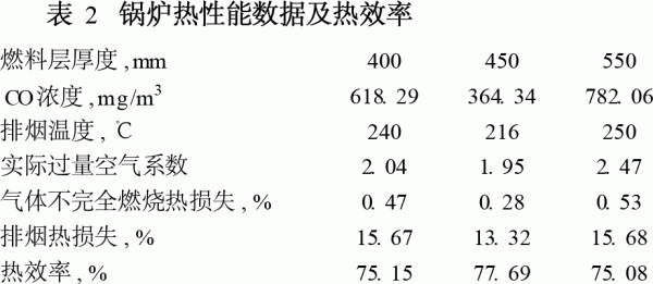 實(shí)驗(yàn)結(jié)果表明:二次送風(fēng)的位置在爐膛中部情況最好,更能夠增加氧氣流與火焰的混合擾動(dòng),CO的燃燒更加充分。提高鍋爐熱效率應(yīng)當(dāng)綜合考慮二次送風(fēng)的位置和配比率這兩個(gè)因素,在爐膛中部送二次風(fēng)、配比率為50%時(shí),鍋爐有最大的熱效率77.69%。這是因?yàn)楦纳拼颂幦毖跞紵缓玫默F(xiàn)象,降低未燃燒氣體損失,從而提高鍋爐的熱效率。可見二次送風(fēng)位置應(yīng)該在爐膛燃燒最不充分的地方,使燃料的化學(xué)熱充分的釋放出來。 (4)在確定本鍋爐的空氣供給量為16m3/h,過量空氣系數(shù)是1.95,二次送風(fēng)的配比率為總風(fēng)量的50%、在爐膛中部送時(shí),考察燃料層厚度的改變對(duì)鍋爐熱性能的影響。試驗(yàn)結(jié)果如表2。