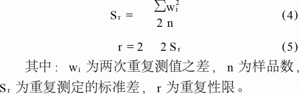 根據(jù)上述公式(1)、(2)、(3)計(jì)算,30種樣品兩種測試方法(以庫侖滴定法結(jié)果減去硫酸鋇質(zhì)量法結(jié)果)平均差值d=-0.50,差值的標(biāo)準(zhǔn)值Sd=0.44,t=5.21,查表得t0.05,20=2.09,因t>t0.05,20,表明2種方法間存在顯著性差異,庫侖滴定法測值均低于硫酸鋇質(zhì)量法,兩種方法結(jié)果的差值d的95%置信區(qū)間為0.42~-1.42,其最大端值遠(yuǎn)大于國標(biāo)GB/T 1574—2007規(guī)定的再現(xiàn)性臨界差0.60,因此兩種方法不可互相替代,原因可能是固體生物質(zhì)燃料灰中高含量氯對庫侖法測定三氧化硫存在干擾,故庫侖滴定法不適用于固體生物質(zhì)燃料灰中三氧化硫的測定。固體生物質(zhì)燃料灰中的三氧化硫的測定應(yīng)采用GB/T 1574—2007中的硫酸鋇質(zhì)量法。 3.2各項(xiàng)測定方法精密度評估 精密度評估公式如下: