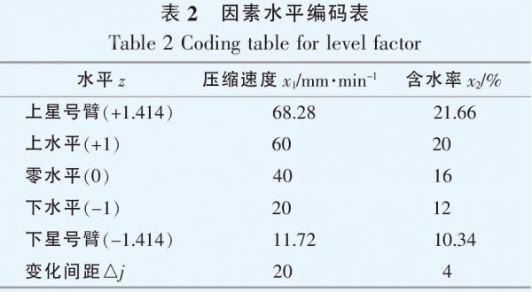 由表1可以看出,雖然同一種秸稈原料在不同壓縮成型條件下的比能耗有所差異,但都存在相同的變化規(guī)律,即當原料含水率一定時,隨著壓縮速度的增加,比能耗逐漸減小;當壓縮速度一定時,隨著含水率的增加,比能耗也相應減小。不同秸稈原料的比能耗差異較大,其中稻草比能耗變化范圍最大,玉米芯次之,小麥秸稈、玉米秸稈和棉花秸稈的比能耗比較接近且較小,說明當冷態(tài)壓縮成型的工藝參數(shù)(如物料含水率和壓縮速度)在一定范圍變化時,稻草和玉米芯的適應性較差,壓縮成型效果不佳。 2.3比能耗回歸模型 從5種秸稈顆粒冷態(tài)壓縮成型試驗結果可知,壓縮速度和物料含水率對比能耗的影響較大。為了進一步研究壓縮速度和含水率對比能耗的影響程度,現(xiàn)以小麥秸稈為例,采用二次回歸通用旋轉組合設計,建立小麥秸稈的比能耗二次回歸模型。 2.3.1試驗方法 試驗設計的因素水平編碼見表2。