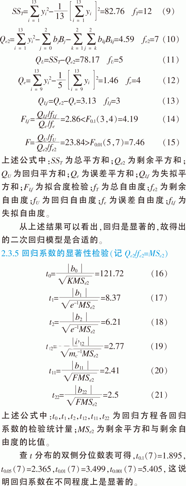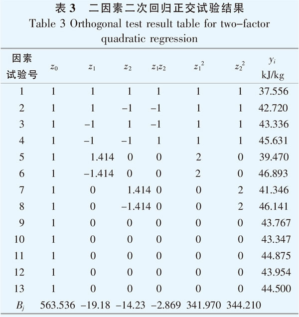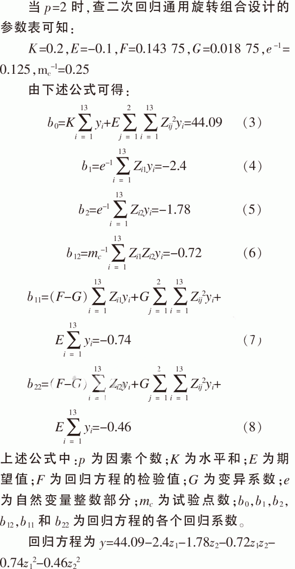 表3中,z0,z1,z2為單因素水平,z1z2,z12,z22為兩因素交互作用水平,yi為響應變量。 2.3.3回歸系數(shù)計算